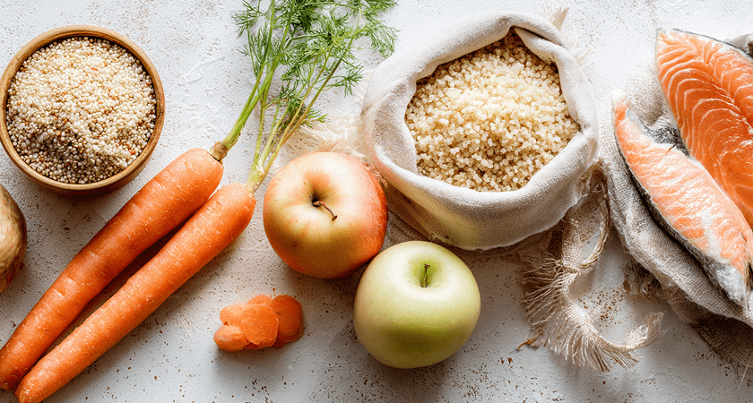 Основу рациона составляют гипоаллергенные продукты, нейтральные крупы — рис, гречка, кукуруза, овсянка. Среди овощей подойдут кабачки, капуста разных видов, патиссоны, огурцы, зелень, а также предварительно вымоченный картофель. Фрукты — в ограниченном количестве, предпочтительнее зелёные сорта яблок и груш. Из мяса — индейка, кролик, постная говядина. Важно готовить блюда щадящим способом: варить, тушить, готовить на пару.